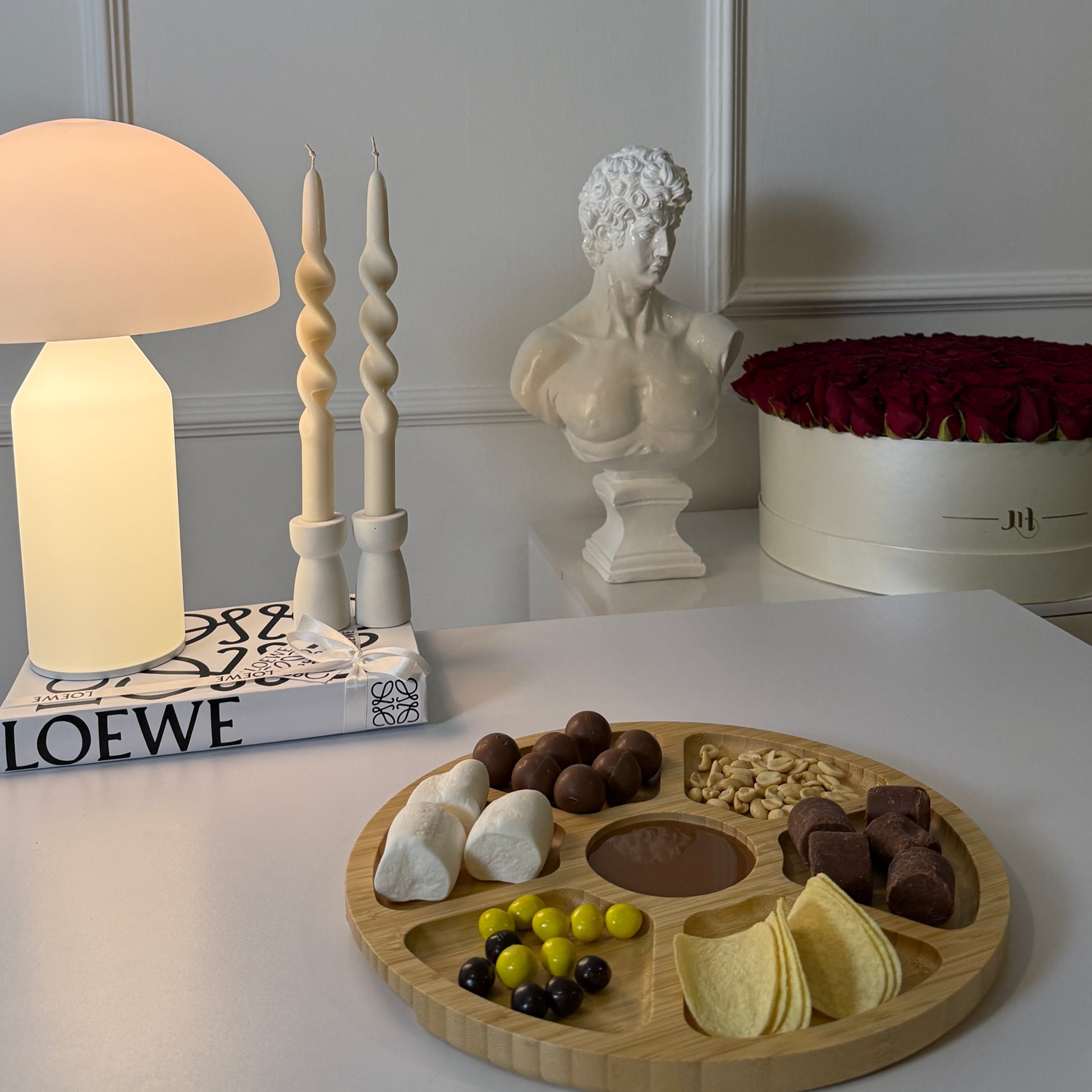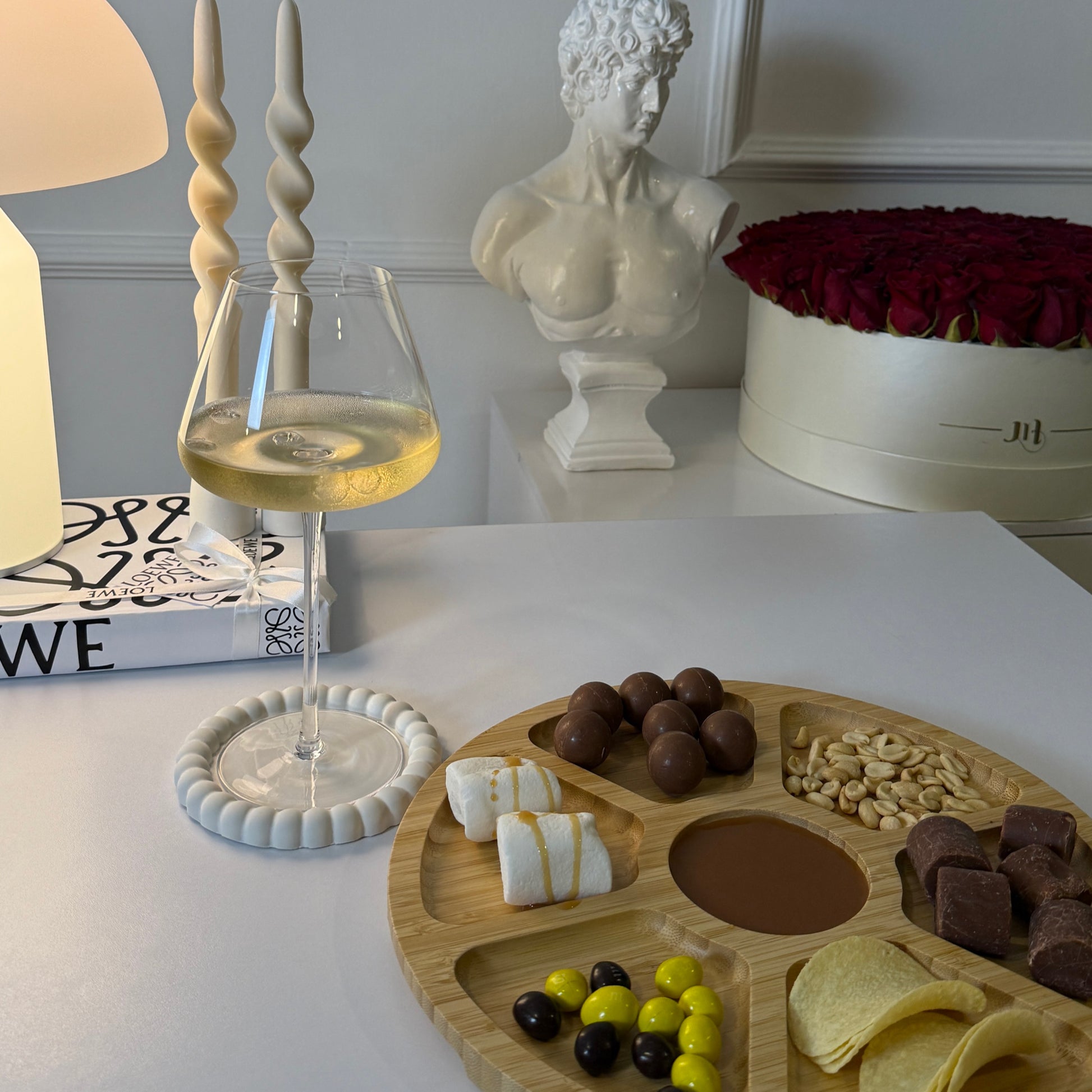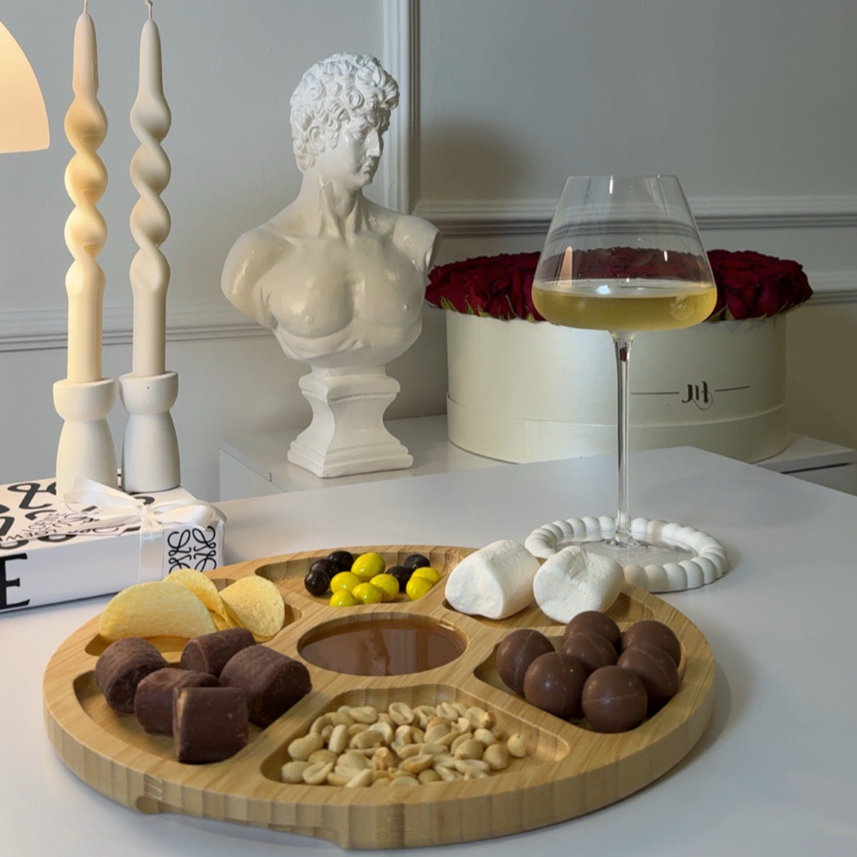 Nuestra Tabla para Quesos Partagée, cuenta con 7 compartimentos que permiten organizar distintos tipos de quesos, frutas, frutos secos y acompañamientos de forma práctica y estética. Incluye una tapa transparente que protege el contenido y un mango portátil.